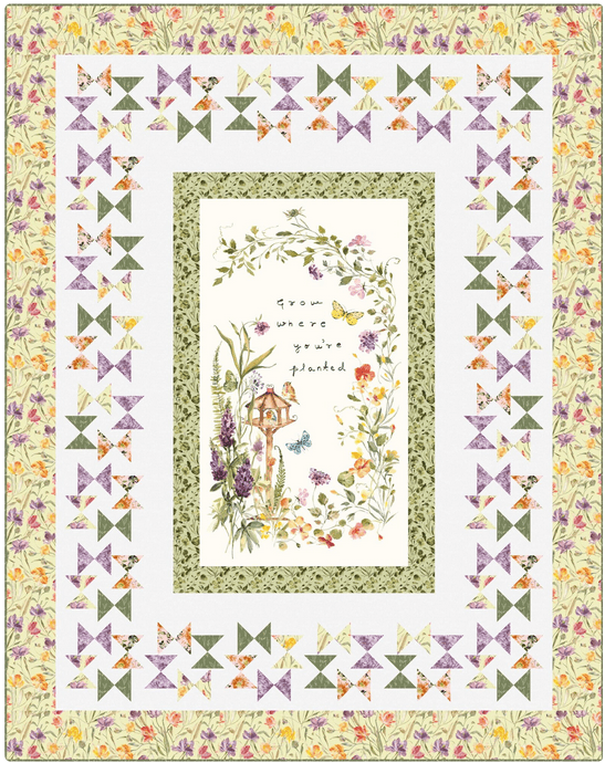 Butterfly Garden quilt kit includes pattern, panel, and fabrics for top and binding.