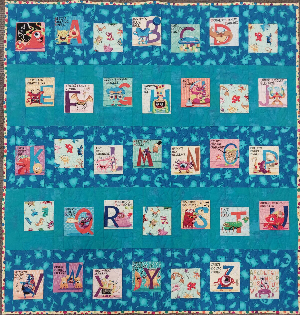 Monster ABC quilt kit includes pattern, panel, and fabrics for top and binding.